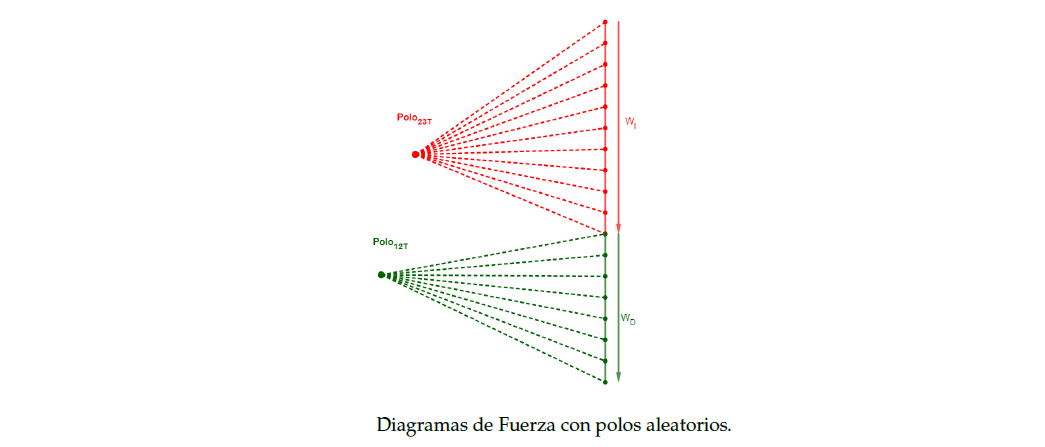 Ya que los apoyos no permanecen en la misma cota, se necesita realizar un método iterativo. En primer lugar, se establece un Polo aleatorio, con el fin de generar dos funiculares cualquiera, que cumplan únicamente las condiciones de contorno en carga.