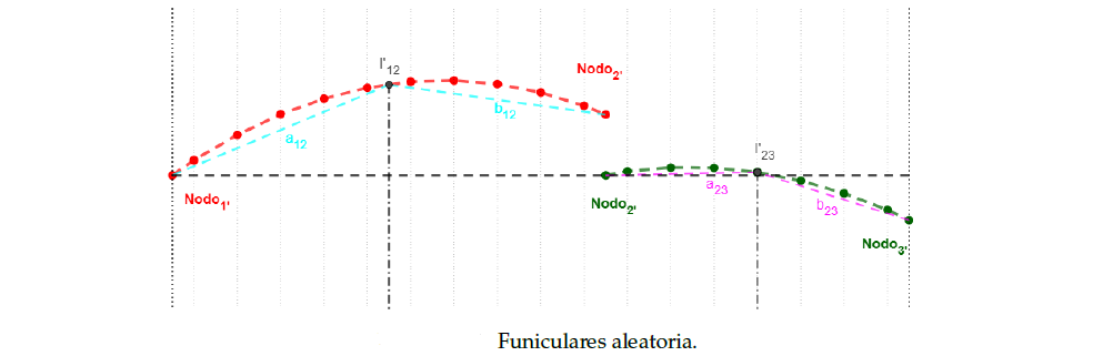 Construyendo las funiculares a través de dichos diagramas de forma, los apoyos 1’, 2’ y 3’ no reflejan ninguna relación con los apoyos originales, se extraen los segmento aij y bij para cada par de apoyos, los cuáles definen la geometría de la funicular aleatoria por los puntos Nodoi′ , Nodoj′ y I′ ij.