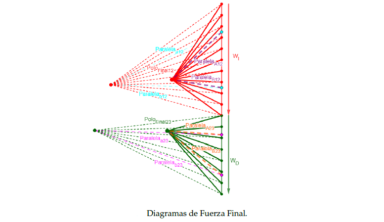 - Diagrama de fuerza discontinuo en rojo, asociado al diagrama de forma impuesto por el usuario, dónde Nip son los segmentos paralelos asociados a a los tirantes del diagrama de forma.