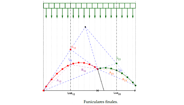 - Para cada par de apoyos ij, se establecen los puntos Iij, hacen alusión a la altura máxima de la funicular resultante, y viene definida por la mitad del segmento Gij - Pij