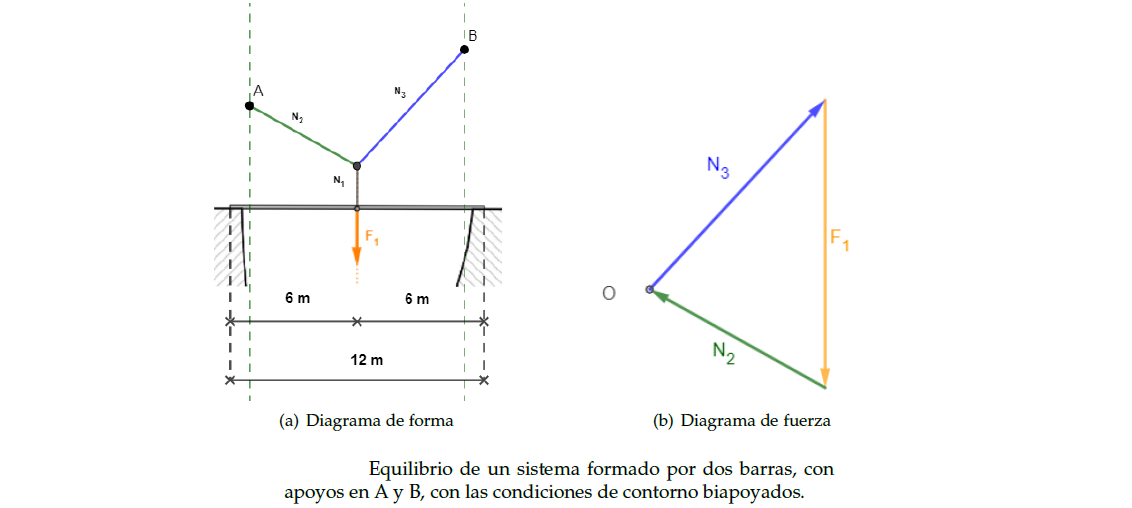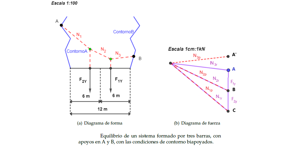 Con respecto al diagrama de fuerza (Figura(b)), las longitudes de los diferentes segmentos en centímetros (N1,N2 y N3) representan los esfuerzos a los que estarían sometidos los diferentes elementos del diagrama de forma.