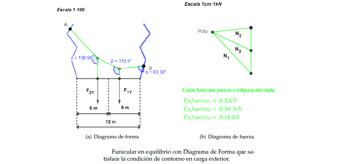 - La Figura (a) muestra una configuración del diagrama de forma del puente en la plataforma Geogebra, donde los puntos A y B son extremos móviles los cuáles el usuario puede modificar para obtener diferentes combinaciones para ver su correspondiente diagrama de Fuerza.