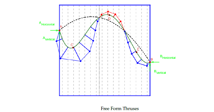 Donde la solución funicular y la curva de control se intersectan, el momento de flexión es cero. Al elegir la magnitud de la fuerza de tensión en el cable de refuerzo, T, se determina completamente la forma del sistema de refuerzo, ya que M = Td, donde d es la distancia perpendicular a la curva de control. Este sistema transforma la curva de control en una línea de empuje con la forma libre deseada.
