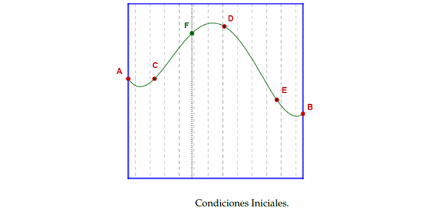 - Se define una curva que tiene cinco puntos de control (A, B, C, D y E), la cuál viene limitada por los puntos A y B (apoyos de la estructura).