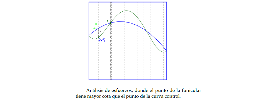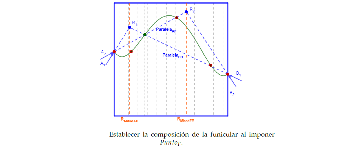 - Se define el punto F, pertenece a la curva generada, y se utiliza para establecer de forma paramétrica funiculares que contengan dicho punto.