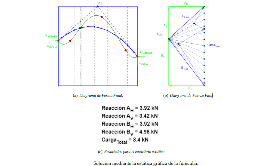 Donde H refleja el empuje horizontal de la estructura, v la distancia vertical entre el punto de la funicular y la curva de control, T es la tensión del cable kN, y d longitud de la barra que genera dicha transformación.