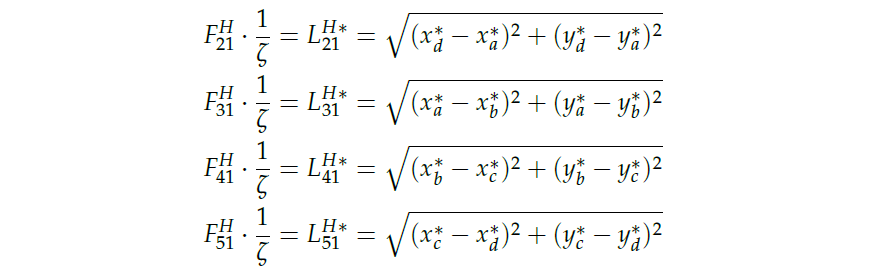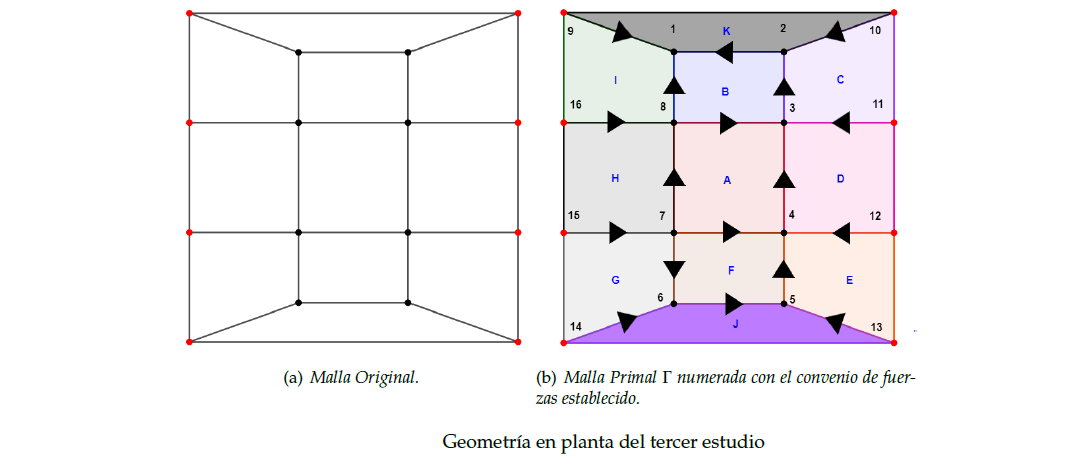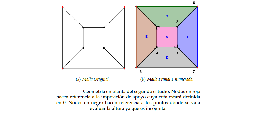 Se reformula en el plano horizontal a través de la geometría de la planta para tener como incógnita la altura de los puntos internos, en este caso sólo uno, en vez de las fuerzas, es decir, la geometría pasa a ser el objetivo de resolución del problema.
