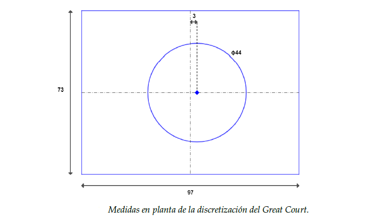 La primera propuesta como ejemplo realizado mediante la resolución matricial es el de la cubierta acristalada del Great Court en el British Museum de Londres, un área rectangular de 73 x 97 metros que contiene una circunferencia de 44 métros de diámetro desplazada con un offset de 3 metros en el eje x que representa la “sala de lectura” o Reading Room. Los datos geométricos se han obtenido de un estudio sobre el desarrollo de la cúpula de J.K.Williams (2001).