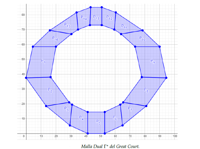 una malla como la mostrada en la Figura 4.8, dónde Pi hace referencia al polígono que representa el equilibrio nodal del punto i en la Malla Primal Γ