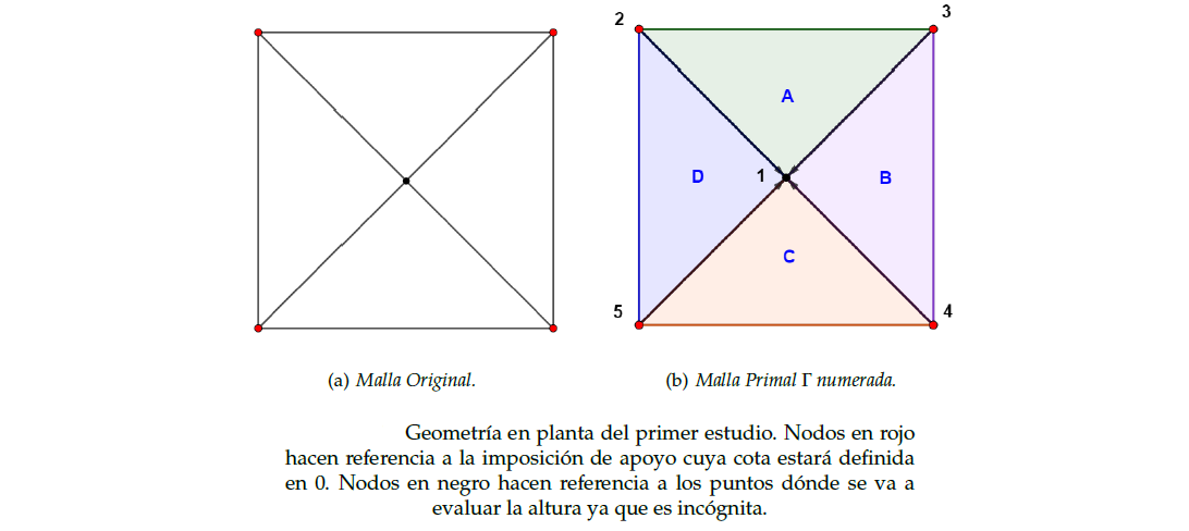 La primera cúpula propuesta presenta una planta rectangular de 2x2 metros discretizada en 5 puntos con un total de 4 secciones. Al ser una planta sencilla, se puede emplear el análisis simple.